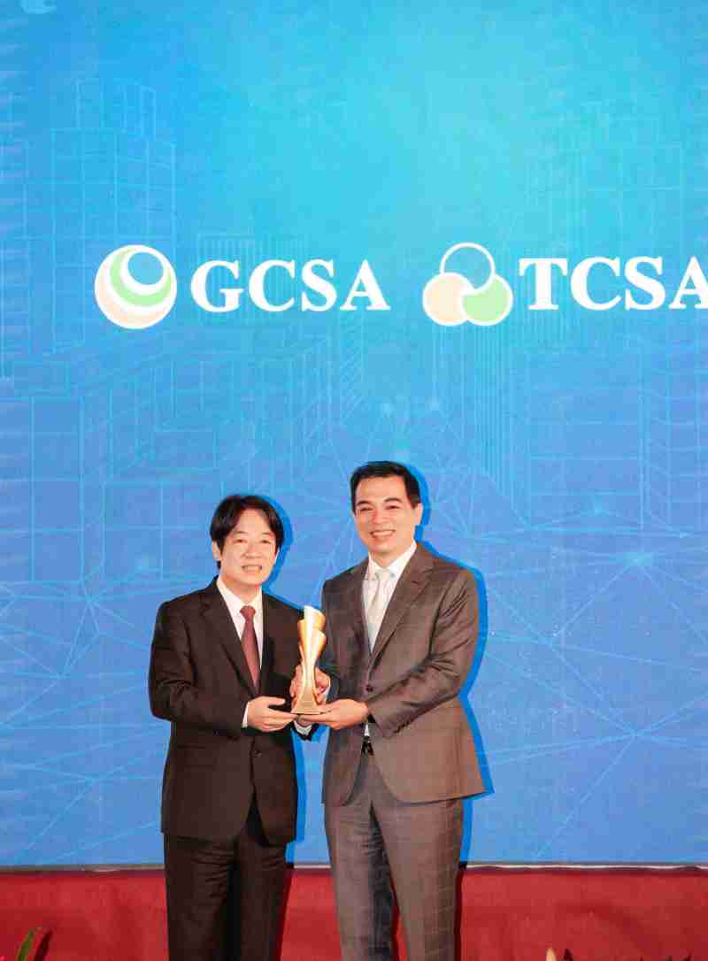 达全方位永续表现获全球永续奖及台湾永续奖肯定,,,,由副总统赖清德颁奖 (左),,,NG大舞台总经理柯富仁 (右) 代表领奖
