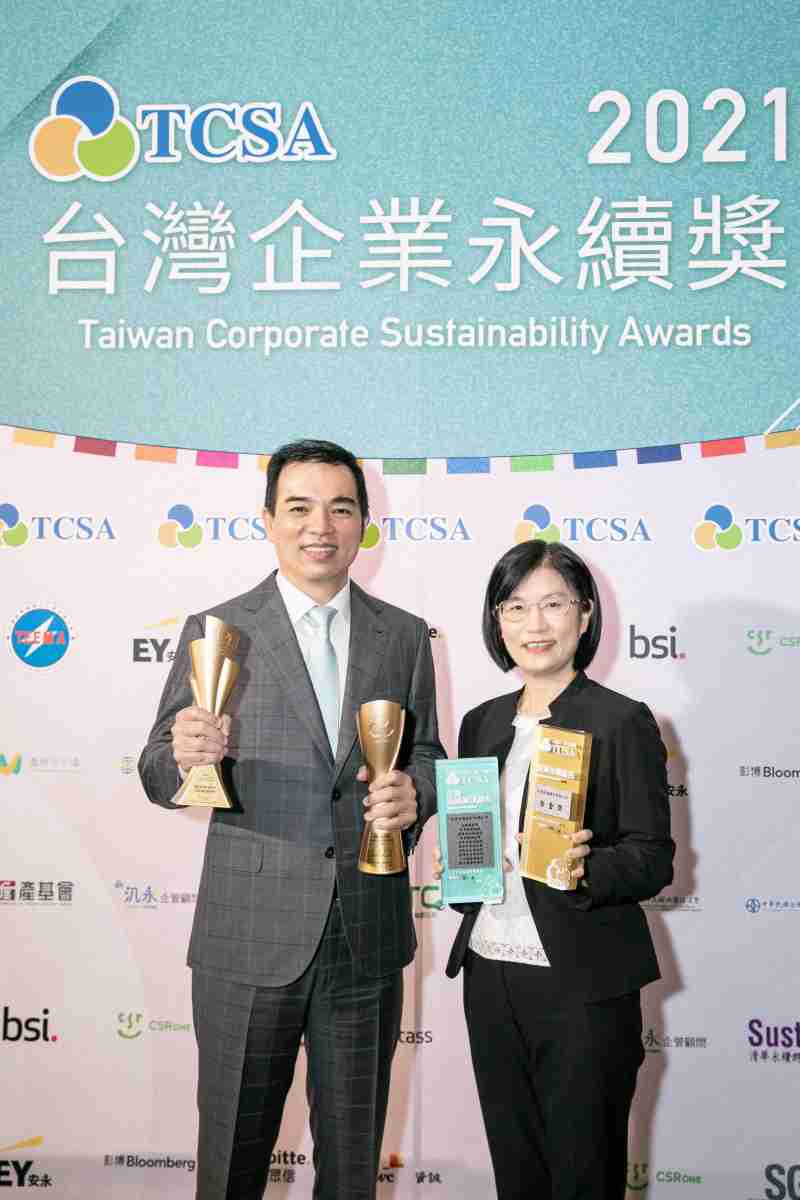 达在台湾永续奖所评比环境、、、、社会、、、治理等各面向的永续绩效均获高度肯定 (左:NG大舞台光电总经理暨营运长柯富仁,,,右:NG大舞台光电永续长古秀华)
