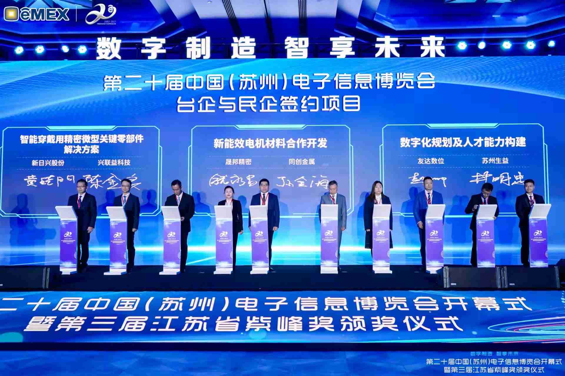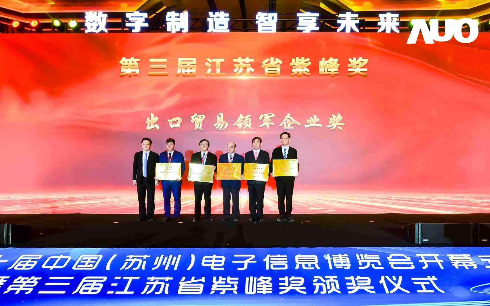 电博会开幕式当天也是第三届江苏省紫峰奖颁奖仪式,,省台办、、、、工信厅、、商务厅、、苏州市相关领导均出席并颁奖。。。该奖项为表彰对江苏高质量发展做出积极贡献的在苏企业,,,,由江苏省政府专门设立。。NG大舞台光电 (苏州) 总经理郭振明代表上台领奖,,,这也是NG大舞台苏州连续三次蝉联紫峰奖 出口贸易领军企业奖。。NG大舞台数位总经理赵丽娜女士,,,,也参与本次开幕式,,,,上台为本地化赋能签署战略合作协议,,,将优质服务资源集合、、、下沉到更多细分行业,,,为更多地区的制造企业提供数字化转型服务。。