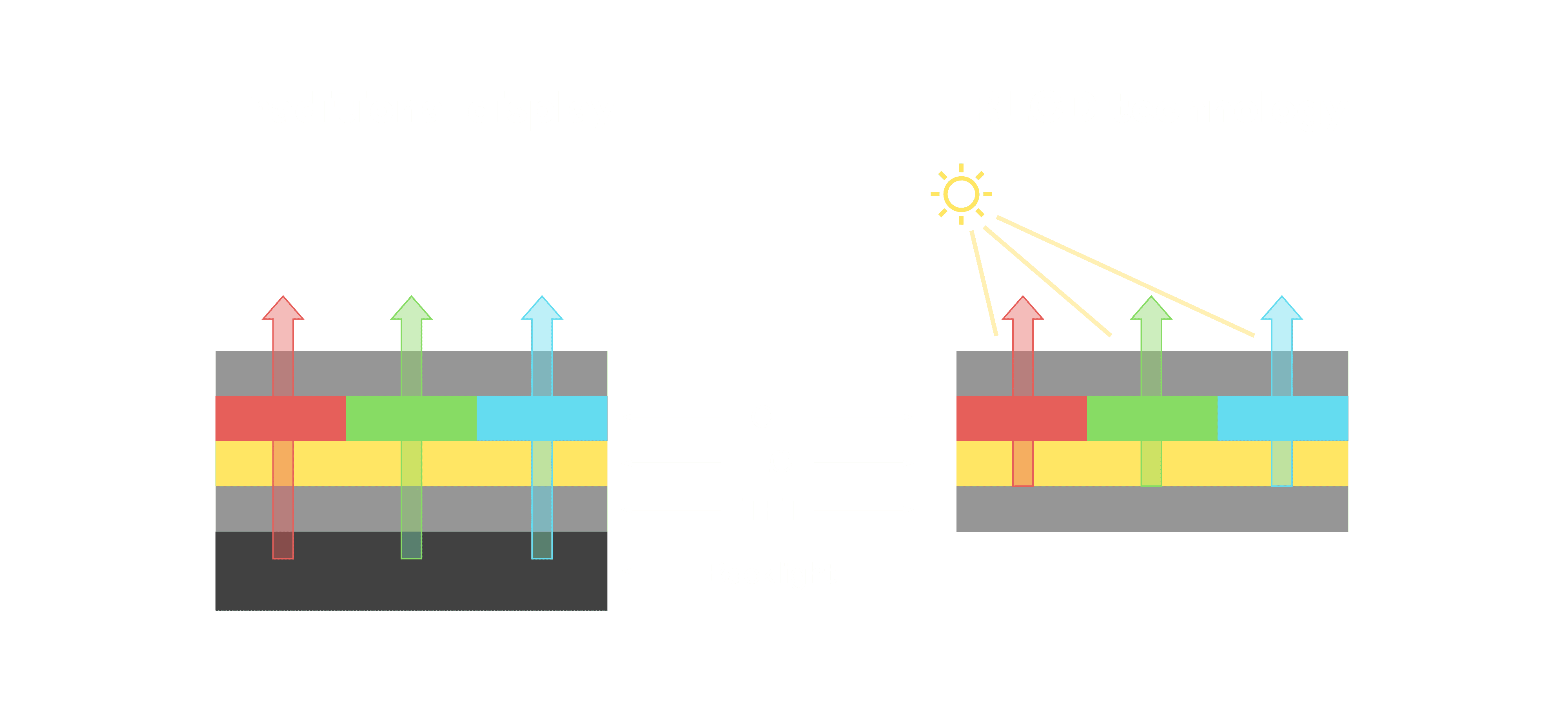 与传统需搭配背光单元的液晶显示相比,,,,反射式液晶技术不仅更省电、、、更轻薄,,且即便在艳阳下仍能清晰显示。。。。此外,,,,少了背光单元,,,,也大幅降低了 LED 蓝光伤害眼睛的疑虑。。。。
